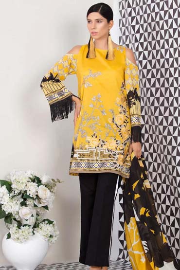 An outfit that portrays the glow coming out of an amber stone, vivid and attractive. This lawn 2-piece has printed shirt, printed dupatta and an embroidered motif for front.