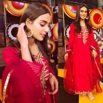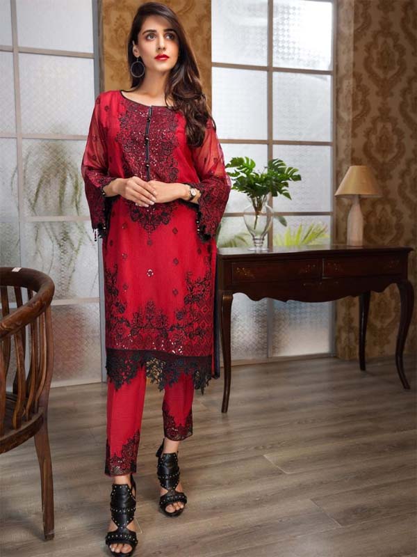 Traditional yet chic! This hot red three piece suit is perfect for formal evenings. The classy combination of red and black topping the charts and making it look 10/10. The fabric used for this three piece is cotton net, the shirt and sleeves are embroidered with cotton net back and silk embroidered trouser.
