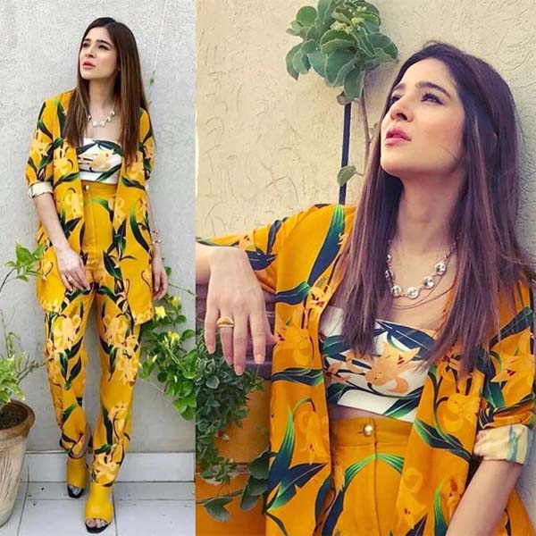 With summers in Karachi, floral vibrant colored dresses are in full swing. Here we can see Ayesha Omar rocking this yellow floral outfit designed by Farah Sanjana.