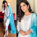 Iqra has accentuated this piece with gold jhumkis and a no makeup look.
