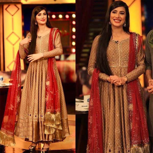 The A-line shirt has intricate embroidery with a hint of red stones. Mehwish has paired the dress with gold chrome peep toes.