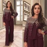 Mehwish Hayat looks stunning in this bronze gold and red piece by Mohsin Naveed Ranjha during promotional event of her upcoming film Load Wedding in Lahore.