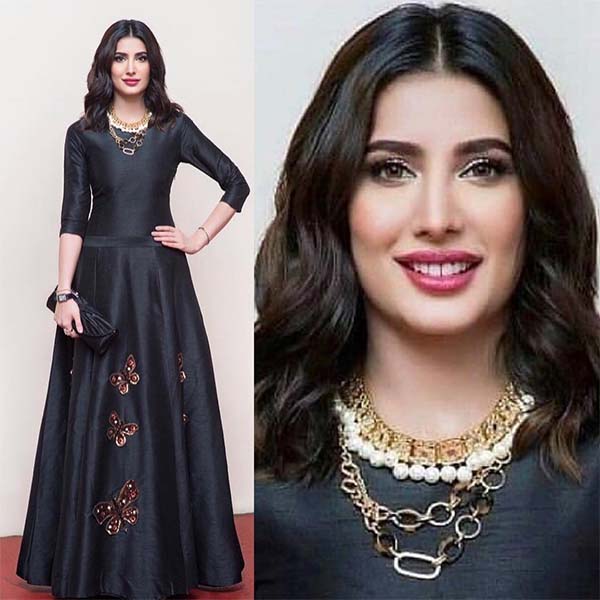 Mehwish Hayat spotted wearing a gorgeous black dress by a Dubai based brand Love Kara for an event in UK. The dress is a beautiful jet black with a fitted bodice and frock like flare at the bottom.