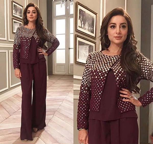 Sarwat Gillani looks stunning in a piece by Natasha Kamal. The monochromatic trend is very well carried off with high waist trousers that is flattering her height and a same color under shirt.